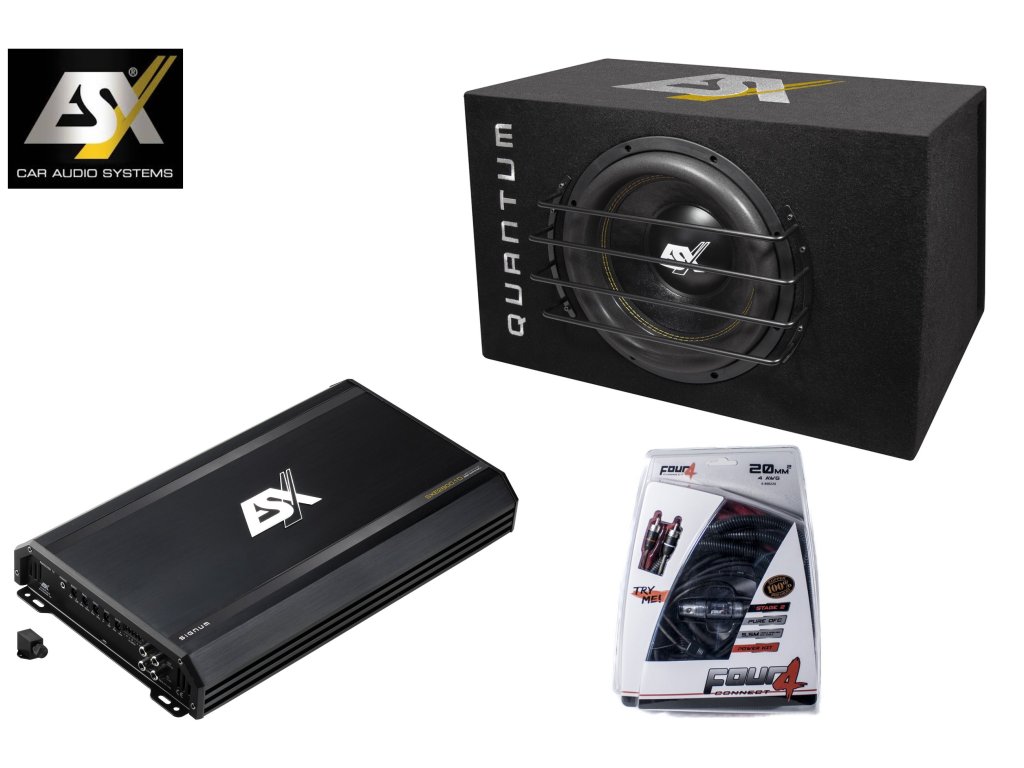 Akční cenově výhodný set složený z 12" subwooferu ESX QXB12 v bassreflexovém boxu, 1-kanálový digitální zesilovač ESX SXE2800.1D včetně dálkové ovládání, napájecí sada Four Connect Stage2 Kit20.