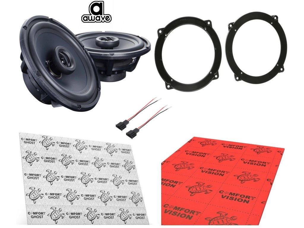 Awave AW650 do vozidla Audi A3 8P. Jedná se o velice povedený set v poměru kvalita/cena/výkon od značky Awave. Používá se většinou do instalací, kde se nahrazují originální reproduktory za nové 2 pásmové koaxiální ve dveřích. Díky jednoduchému, ale za to preciznímu zpracování je jejich cena i tak velice přijatelná. Jsou vhodné na výkon z autorádia. Výhodou je, že zde nemusíte řešit "problém" s umístěním výhybek se při instalaci. Základní balíček pro vytlumení dveří, který je součástí setu.