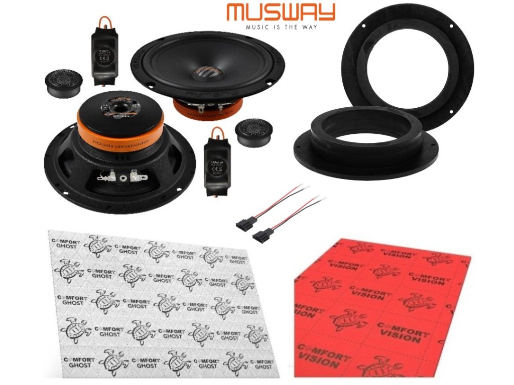 Musway MAE6.2C do vozidla Audi. Zde už se jedná o "High End" reproduktory v poměru kvalita/cena/výkon od značky Musway. Modelová řada Musway Anniversary Edition byla vyvinuta speciálně pro 10. výročí značky MUSWAY. Jsou vhodné na výkon ze zesilovače od 40 - 70 W RMS, ale i na výkon z továrního zesilovače vozu. Díky svému odporu 3 Ohmy dokáže z jednotky továrního zesilovače dostat bezpečně vyšší výkon. Řada MAE se pyšní byla podrobena testu v Německého časopisu Car & Hifi, kde získala skvělou výslednou známku 1,2 (VYŠŠÍ ŘADA). Velikou výhodou jsou velice kompaktní kabelové výhybky pro výškové reproduktory, se kterými nemáte žádný problém při instalaci. Středobasový reproduktor je navržen tak, aby uměl zahrát spodní frekvence již od 50 Hz. Balíček pro základní vytlumení dveří, který je součástí setu.