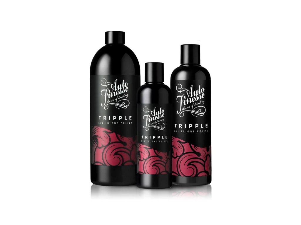 Auto Finesse Tripple All In One Polish patří jednoznačně mezi nejefektivnější leštěnky, které jsou dnes na trhu. Tripple je s příměsí pravého karnaubského vosku a glazury. Auto Finesse Tripple je špičková leštěnka, která dodá laku vašeho auta hluboký a mokrý lesk. Tato leštěnka je vhodná pro odstraňování menších defektů v laku, lehkých škrábánců a oxidace. Disponuje vysokým čistícím účinkem a umí skrývat drobná poškození laku. Tripple odstraňuje oxidaci a kontaminaci pomocí čištících rozpouštědel. Díky obsahu karnaubského vosku nabízí také dlouhou životnost v řádu několika měsíců. Tripple zanechává ultra tenkou ochrannou vrstvu, která právě zakryje drobné vady - glazuru. Dále přidá druhou vrstvu, tentokrát z pravého T1 karnaubského vosku, který chrání povrch, maximalizuje lesk a zvýrazňuje barvy. Tripple funguje velmi rychle. Jeho ultrajemné brusné částečky jsou skvělé na světlé typy barev, neuvěřitelná účinnost se objeví ale i u teplých, tmavých barev, jako je černá, červená apod. Tripple je vhodný jak pro ruční, tak i strojní leštění laku. Tak jako všechny produkty Auto Finesse, tak i Tripple patří mezi profesionální produkty určené pro zkušené detailery. Díky vysoké efektivitě a snadnosti aplikace dosáhne s tímto přípravkem skvělých výsledků i začátečník.