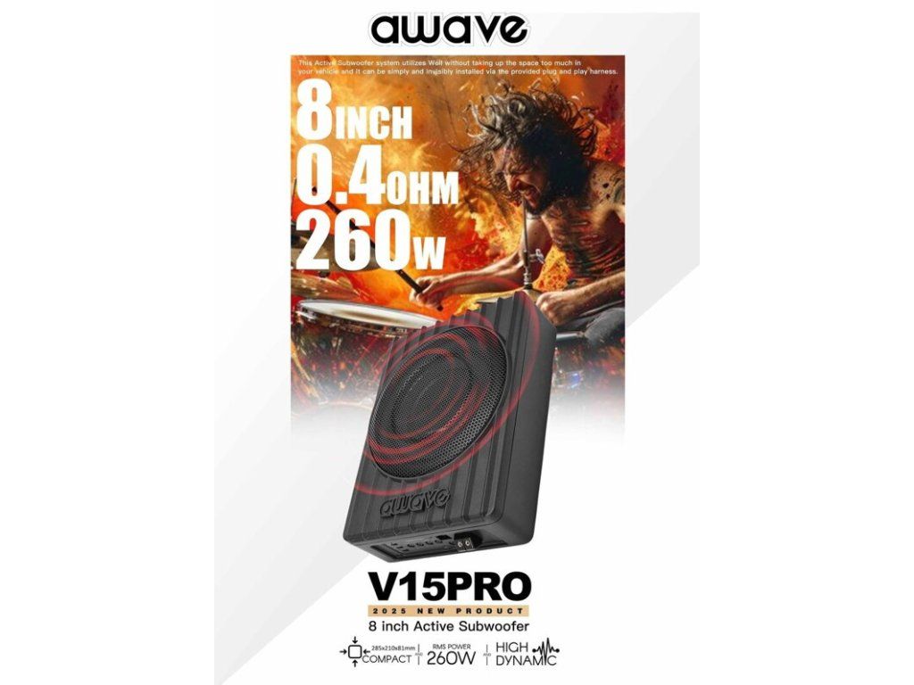 Basy v nejmenší ozvučnici. Pokud je ve vozidle málo místa pro montáž a stávající automobilové hi-fi systémy zoufale potřebují „extra silný“ basový pás bez velké námahy, jsou nové aktivní subwoofery AWAVE V15PRO a V15PRO MAXtou správnou volbou. Poháněné výkonnými integrovanými zesilovači třídy D s výkonem 260 W RMS, odolné měniče s robustními hliníkovými membránami a tepelně odolnými kmitacími cívkami snadno transformují výkon zesilovače na úderné basy.