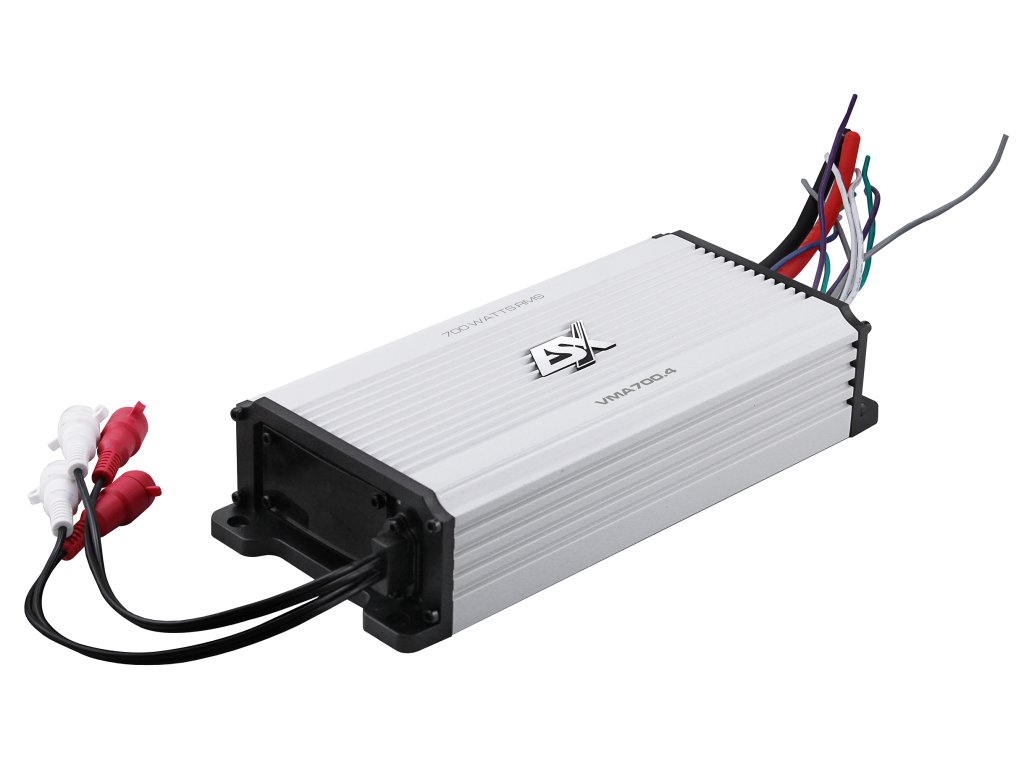 Pro pohon předního a zadního systému je často poměrně nízký výkon rádia s 10-15 wattů na kanál sotva dostačující. Pomoci mohou externí zesilovače, které poskytují výrazně vyšší výkon. Ušlechtilý 4kanálový výkonový zesilovač VMA700.4 snadno dodá více než 10krát více. S rozměry pouhých 11x25 cm je velmi kompaktní i přes obrovský výkon 175 wattů RMS na kanál, a proto si vždy najde vhodné místo i v menších lodích. Všechny ovládací prvky a výhybky jsou chráněny za šroubovaným krytem.
