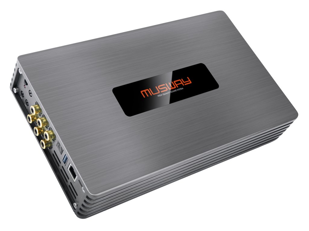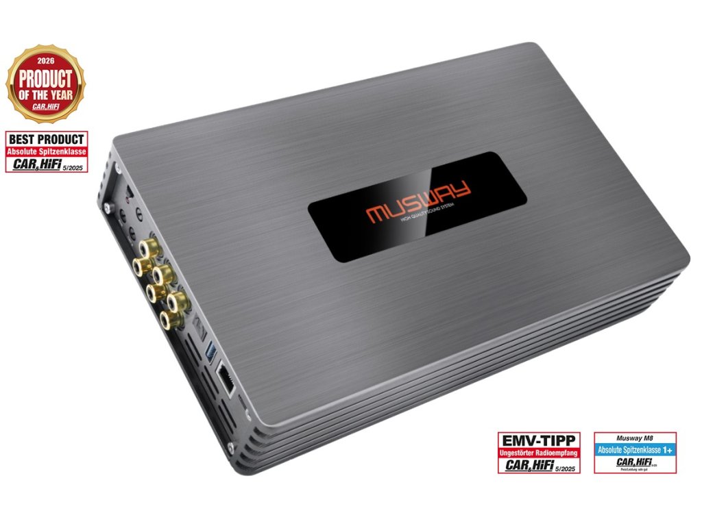 M8 – nový referenční zesilovač MUSWAY s 12kanálovým DSP – je nejnovějším geniálním tahem a výsledkem důsledného dalšího vývoje řady M, která je nyní k dispozici se 4, 5, 6, 8, 10 a 12 interními kanály. Stejně jako M10 je i M8 s vynikajícím zpracováním a výkonem 1250 W speciální vícekanálová varianta vybavená dvěma extra výkonnými, dodatečnými kanály s vysokým výkonem. Šest kanálů poskytuje 80 nebo 135 wattů RMS, zatímco dva výkonnější kanály, 7 a 8, se mohou pochlubit 120, respektive 220 wattů RMS.