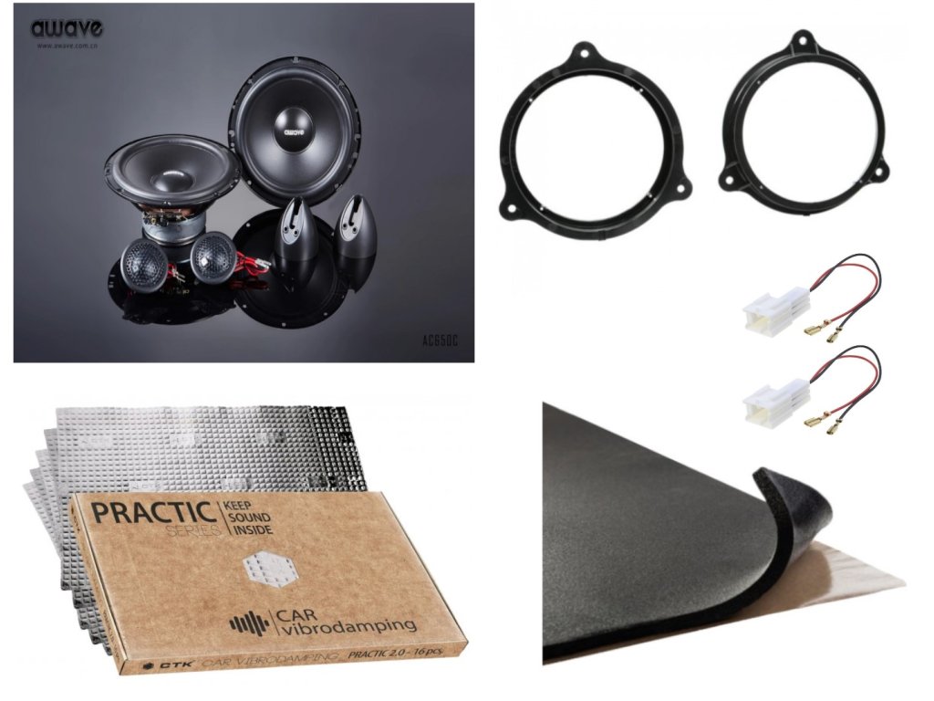 Set č.3 - Awave AC 650C do vozidla Renault Megane IV. Jedná se o velice povedený set v poměru kvalita/cena/výkon od značky Awave. Používá se většinou do instalací, kde se nahrazují originální reproduktory za nové 2 pásmové komponentní ve dveřích. Díky jednoduchému zpracování je jejich cena velice přijatelná. Jsou vhodné na výkon z autorádia. Výhodou jsou velice kompaktní kabelové výhybky pro výškové reproduktory, se kterými nemáte žádný problém při instalaci. Základní balíček pro vytlumení dveří, který je součástí setu.