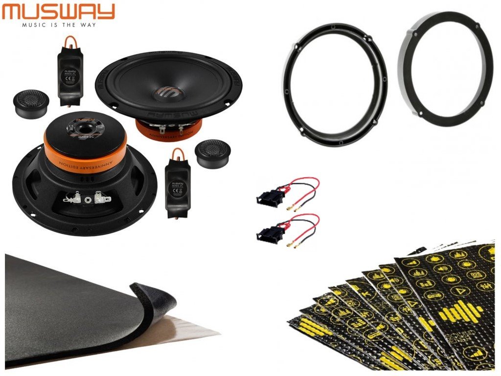 Set č.7 - Musway MAE6.2C do vozidla Škoda Octavia II. Zde už se jedná o "High End" reproduktory v poměru kvalita/cena/výkon od značky Musway. Modelová řada Musway Anniversary Edition byla vyvinuta speciálně pro 10. výročí značky MUSWAY. Jsou vhodné na výkon ze zesilovače od 40-70 W RMS, ale i na výkon z továrního zesilovače vozu. Díky svému odporu 3 Ohmy dokáže z jednotky továrního zesilovače dostat bezpečně vyšší výkon. Řada MAE se pyšní byla podrobena testu v Německého časopisu Car & Hifi, kde získala skvělou výslednou známku 1,2 (VYŠŠÍ ŘADA). Velikou výhodou jsou velice kompaktní kabelové výhybky pro výškové reproduktory, se kterými nemáte žádný problém při instalaci. Středobasový reproduktor je navzřen tak, aby uměl zahrát spodní frekvence již od 50 Hz. Balíček pro základní vytlumení dveří, který je součástí setu.