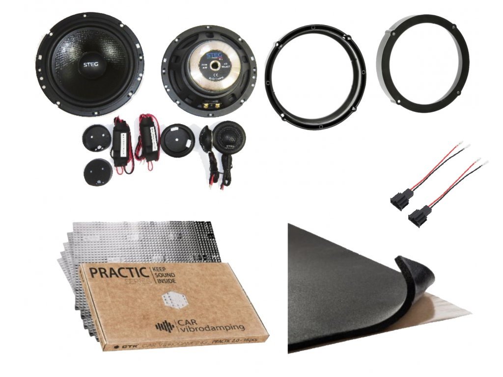Set č.2 - Steg SQL 650C do vozidla Škoda Octavia IV. Jedná se o velice povedený set v poměru kvalita/cena/výkon od značky Steg. Použivá se většinou do instalací, kde se nahrazují originální reproduktory za nové 2 pásmové komponentní ve dveřích. Díky jednoduchému zpracování je jejich cena velice přijatelná. Jsou vhodné na výkon z autorádia, ale jsou vhodné i na zesilovače o výkonu 40-60W RMS na kanál. Výhodou jsou velice kompaktní kabelové výhybky pro výškové reproduktory, se kterými nemáte žádný problém při instalaci. Základní balíček pro vytlumení dveří, který je součástí setu.