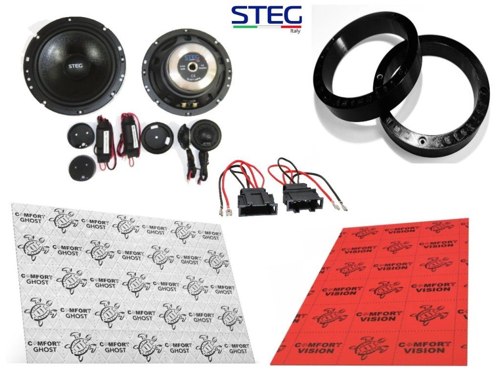 Steg SQL 650C do vozidel Škoda. Jedná se o velice povedený set v poměru kvalita/cena/výkon od značky Steg. Používá se většinou do instalací, kde se nahrazují originální reproduktory za nové 2 pásmové komponentní ve dveřích. Díky jednoduchému zpracování je jejich cena velice přijatelná. Jsou vhodné na výkon z autorádia, ale doporučujeme na zesilovač o výkonu 40 - 70 W RMS na kanál. Výhodou jsou velice kompaktní kabelové výhybky pro výškové reproduktory, se kterými nemáte žádný problém při instalaci. Balíček pro vytlumení a odhlučnění dveří je součástí setu.
