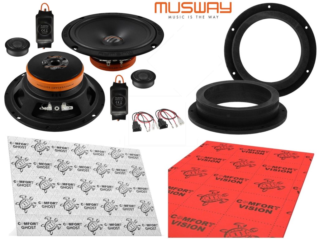Musway MAE6.2C do vozidla Škoda Superb IV. Zde už se jedná o "High End" reproduktory v poměru kvalita/cena/výkon od značky Musway. Modelová řada Musway Anniversary Edition byla vyvinuta speciálně pro 10. výročí značky MUSWAY. Jsou vhodné na výkon ze zesilovače od 40 - 70 W RMS, ale i na výkon z továrního zesilovače vozu. Díky svému odporu 3 Ohmy dokáže z jednotky továrního zesilovače dostat bezpečně vyšší výkon. Řada MAE se pyšní byla podrobena testu v Německého časopisu Car & Hifi, kde získala skvělou výslednou známku 1,2 (VYŠŠÍ ŘADA). Velikou výhodou jsou velice kompaktní kabelové výhybky pro výškové reproduktory, se kterými nemáte žádný problém při instalaci. Středobasový reproduktor je navzřen tak, aby uměl zahrát spodní frekvence již od 50 Hz. Balíček pro základní vytlumení dveří, který je součástí setu.