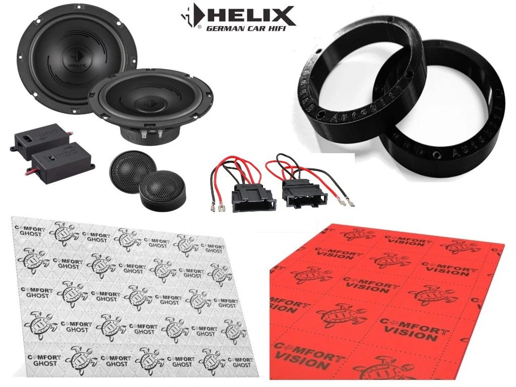 Helix PF K165.2 do vozidla Volkswagen Golf. Jedná se o vyšší řadu reproduktorů od značky Helix. Používá se většinou do instalací, kde se nahrazují originální reproduktory za nové 2 pásmové komponentní ve dveřích. Díky jednoduchosti, ale zároveň i genialitě zpracování je cena velice přijatelná. Jsou vhodné na výkon z autorádia. Plnohodnotné výhybky jak pro středobasový, tak pro výškový reproduktor, zajistí dynamický a přesný zvuk. Jejich potenciálem je právě přesnost, ráznost a dynamika, které tyto reproduktory zvládají na jedničku. Velikost vyhýbek není příliš velká, tudíž není žádný problém při instalaci. Balíček pro vytlumení a odhlučnění dveří je součástí setu.
