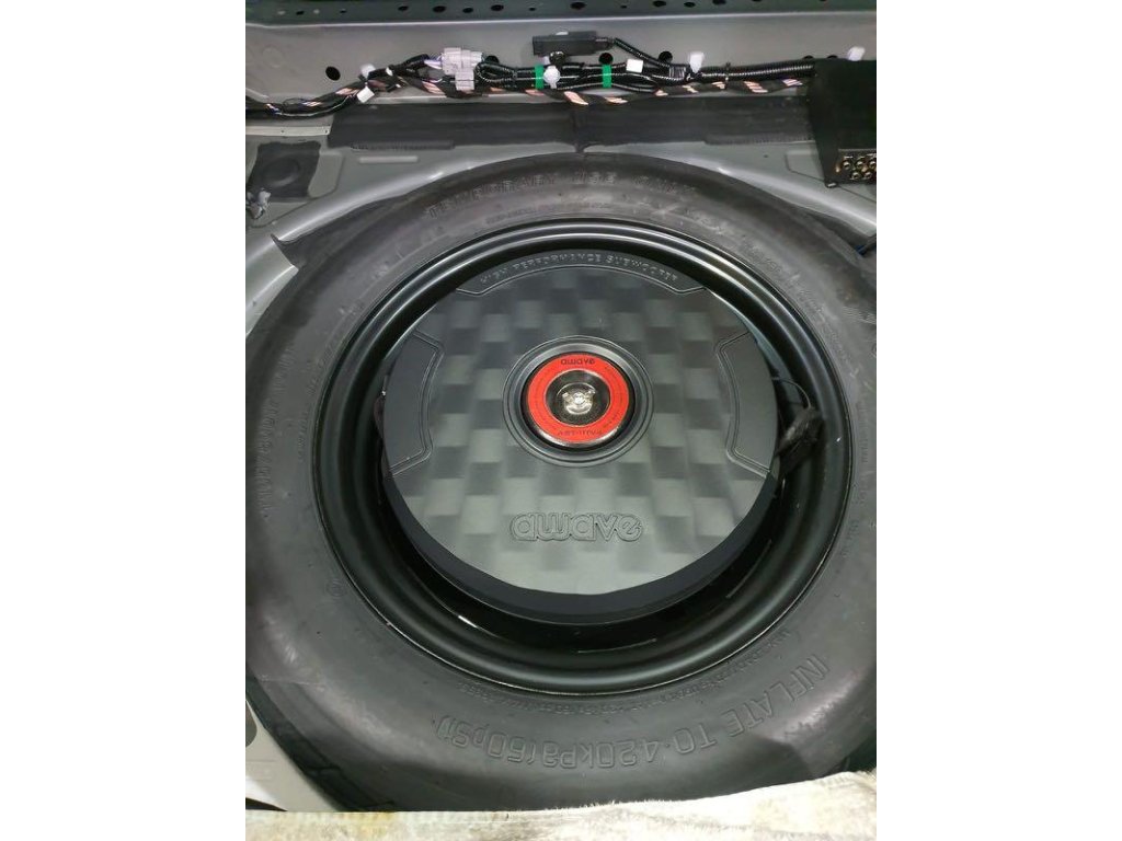 Aktivní subwoofer s velikostí reproduktoru 11 „/27.5cm. Štíhlá konstrukce pro pohodlnou montáž do rezervního kola.