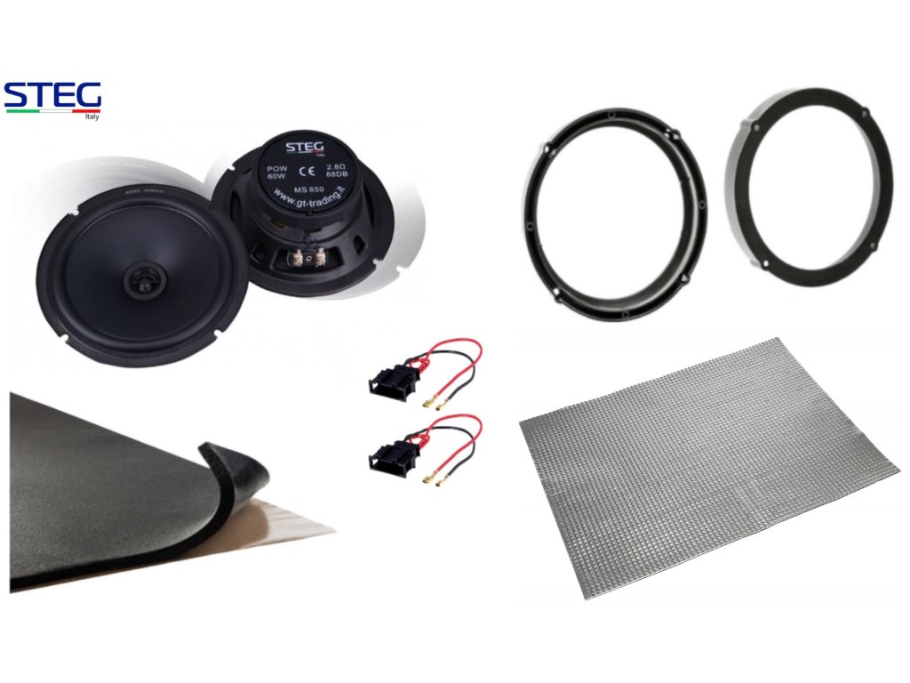 Set č.4 - Steg MS650 do vozidla Volkswagen New Beetle. Jedná se o velice vyvážené a skvěle hrající koaxiální reproduktory od značky Steg. Používají se většinou do instalací, kde se nahrazují originální reproduktory za nové 2 pásmové koaxiální v zadních dveřích. Díky skvělému, jednoduchému, ale za to preciznímu zpracování se řadí zvukově k repruduktorům vyšší střední třídy. Jsou vhodné na výkon z autorádia. Základní balíček pro vytlumení dveří, který je součástí setu.